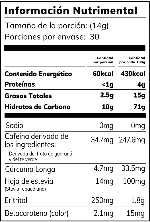 - Mezcla en polvo para bebida energética saludable y baja en calorías, elaborada con extractos de guaraná, té verde y yerba mate.