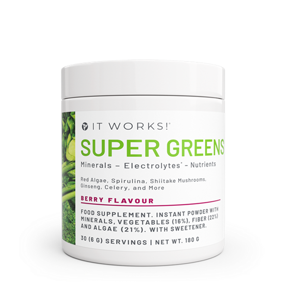 IT WORKS! Super Greens – Berry is a convenient daily greens powder food supplement with minerals and fiber. This berry-flavored blend combines ingredients from land and sea. This berry-flavoured blend provides magnesium, potassium and calcium together with sprouts, leafy greens, algae and sea vegetables in an easy-to-mix powder. Magnesium contributes to normal energy-yielding metabolism1, electrolyte balance2 and the reduction of tiredness and fatigue3. Potassium contributes to normal muscle function4 and the maintenance of normal blood pressure5, while calcium contributes to the normal function of digestive enzymes6. Simply mix with water or your favourite drink to add greens and minerals to your everyday routine as part of a balanced diet and healthy lifestyle.